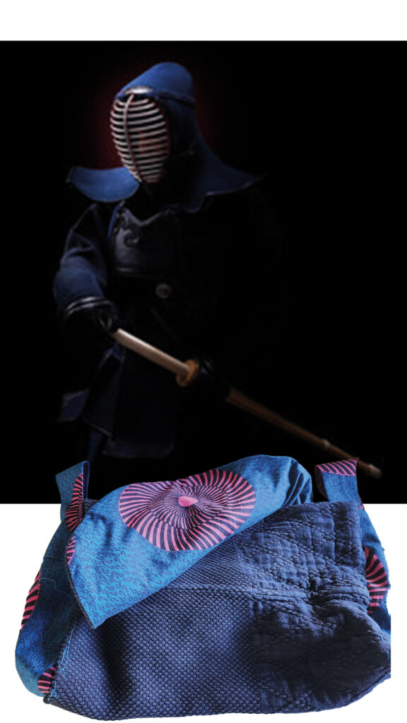 Ce sac unique a été confectionné à partir d’un kimono de kendo usagé, riche de ses traces de pratique et de vécu que Luc m’a confié.